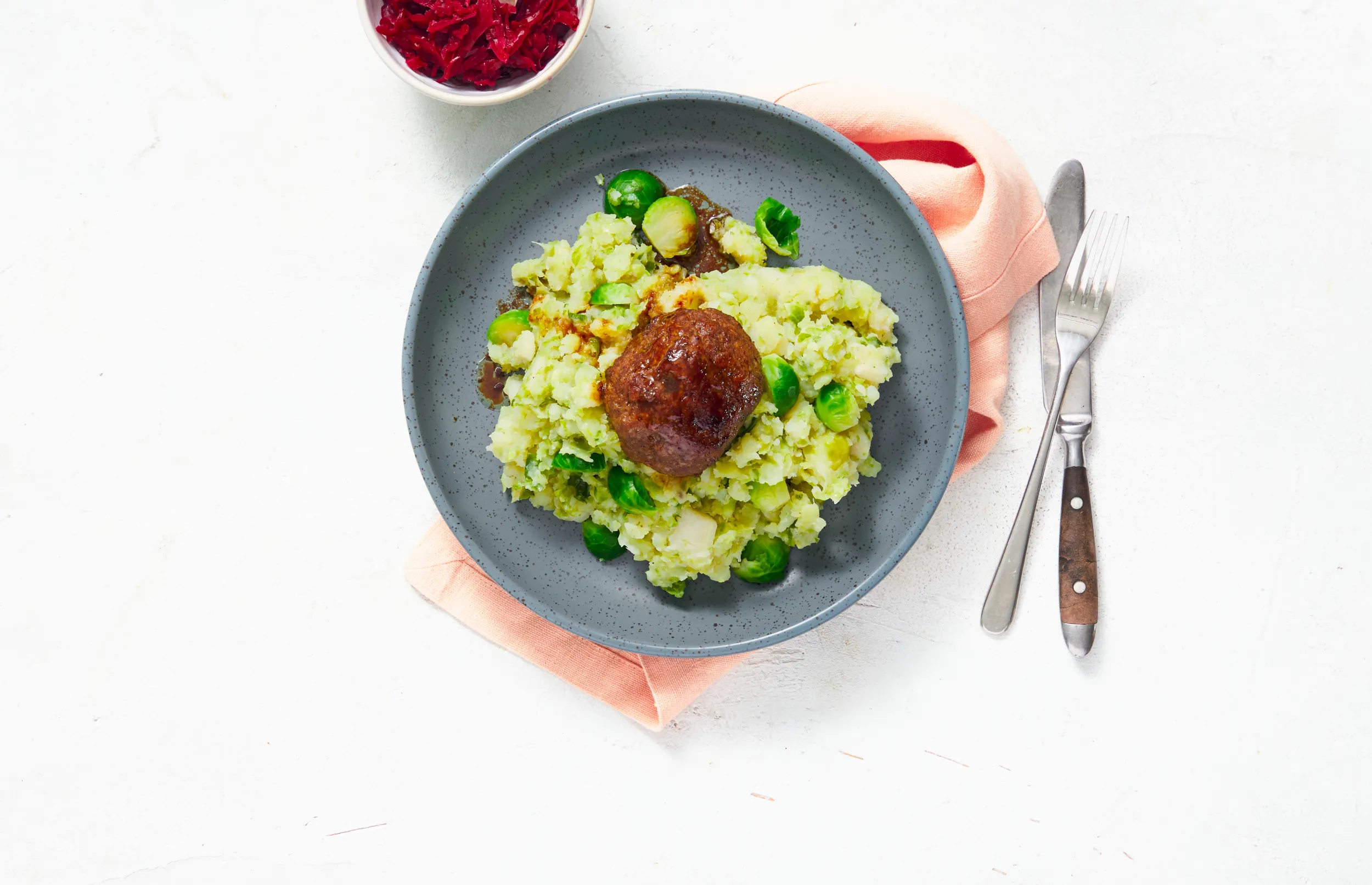 Spruitjesstamppot met kip-hertgehaktbal en rode kool met appeltjes