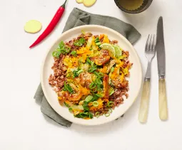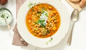 Voeg 1 bakje soepspecerijen bij de groenten en bak zachtjes tot de geuren vrijkomen. Voeg de voorgekookte bulgur (incl. bouillon) en 1 pakje kikkererwten (inclusief vocht voor extra eiwit!) toe. Kook het geheel zachtjes nog ca. 5 minuten.