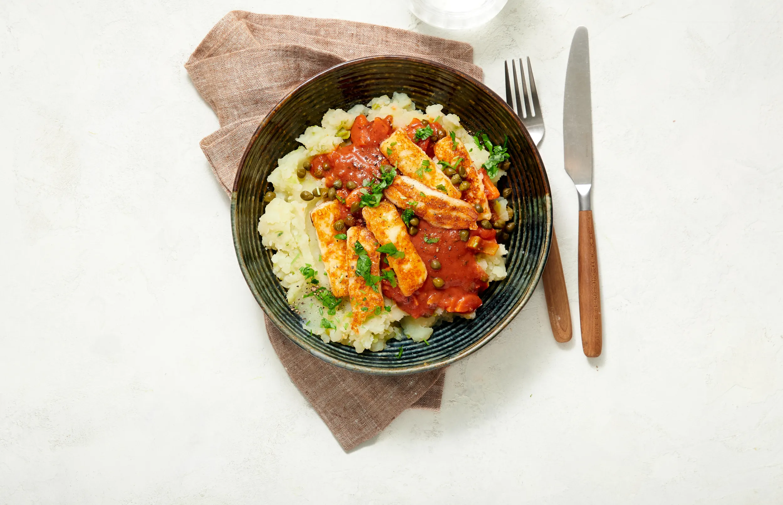 Serveer de preistamppot met de tomatensaus en de grillkaas. Garneer met 1½ el kappertjes en peterselie.