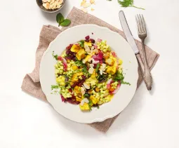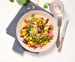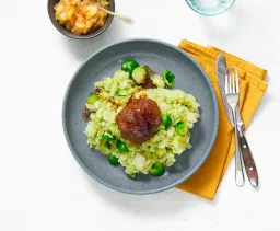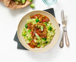 Spruitjesstamppot met kip-hertgehaktbal en rode kool met appeltjes
