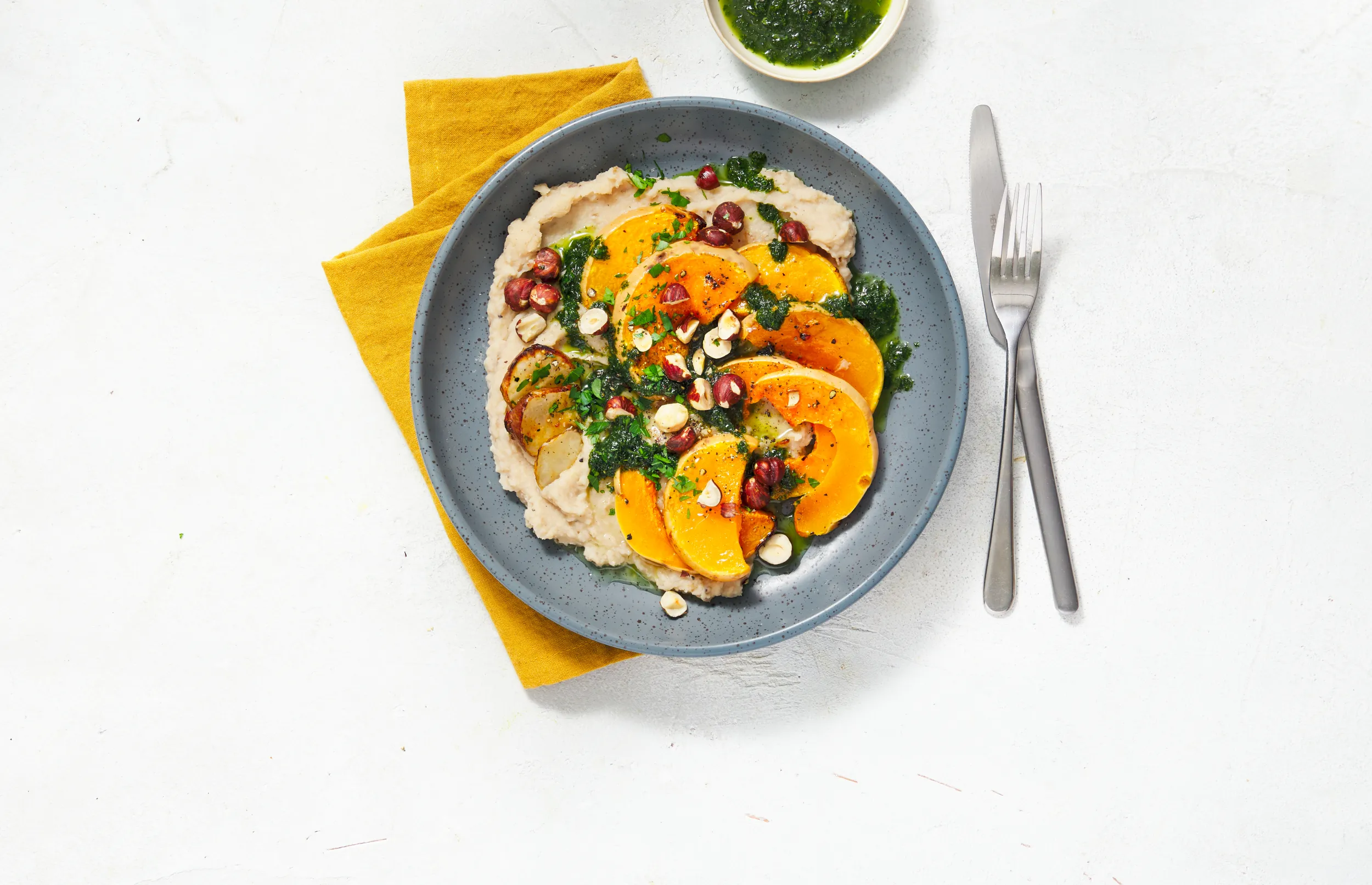 Serveer de bonen-aardpeerpuree met de pompoen, besprenkel royaal met de kruidenolie en bestrooi met de hazelnoten.