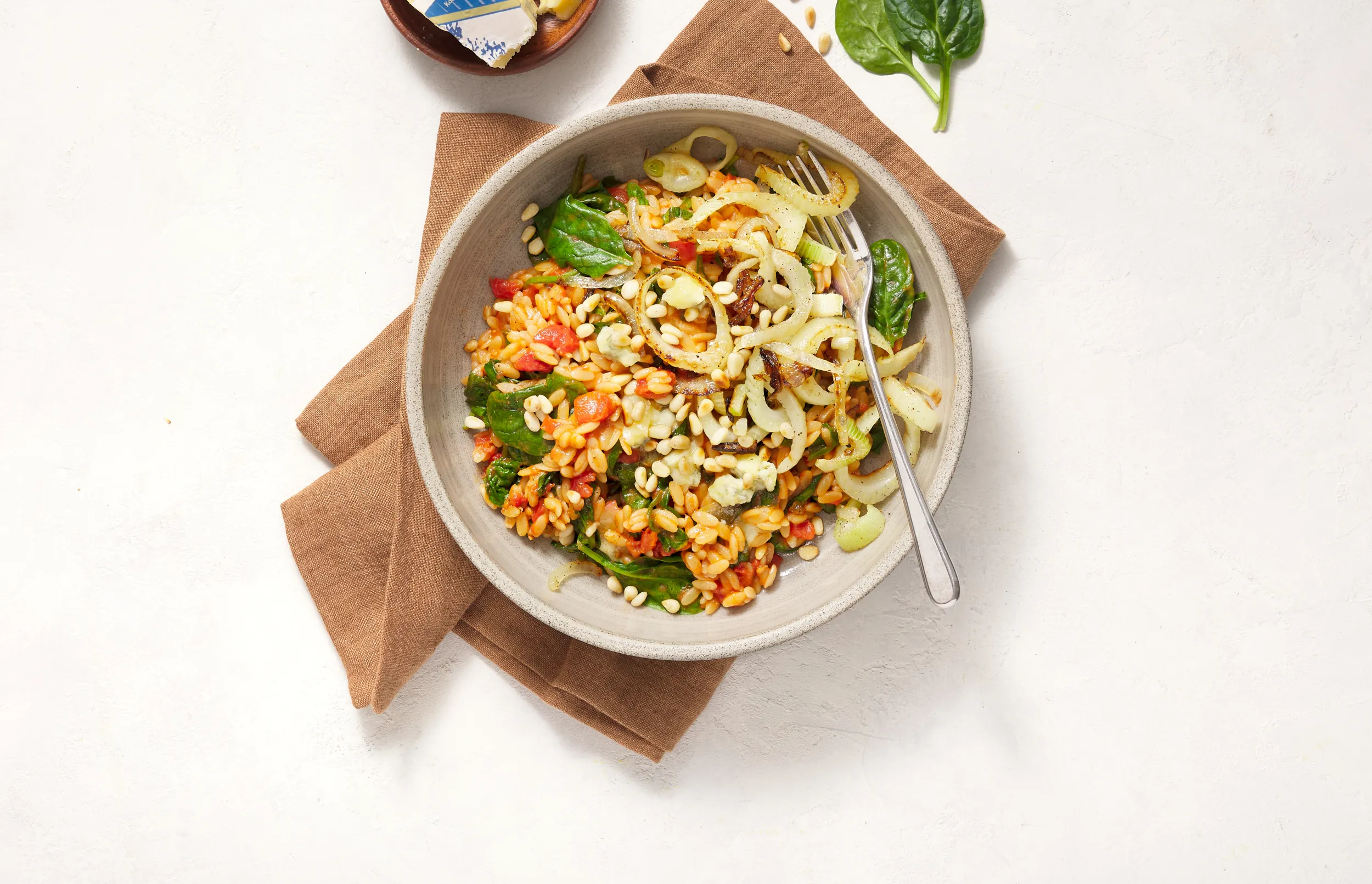 Tomatenorzo met spinazie, venkel, sjalot, blauwe kaas, pijnboompitten