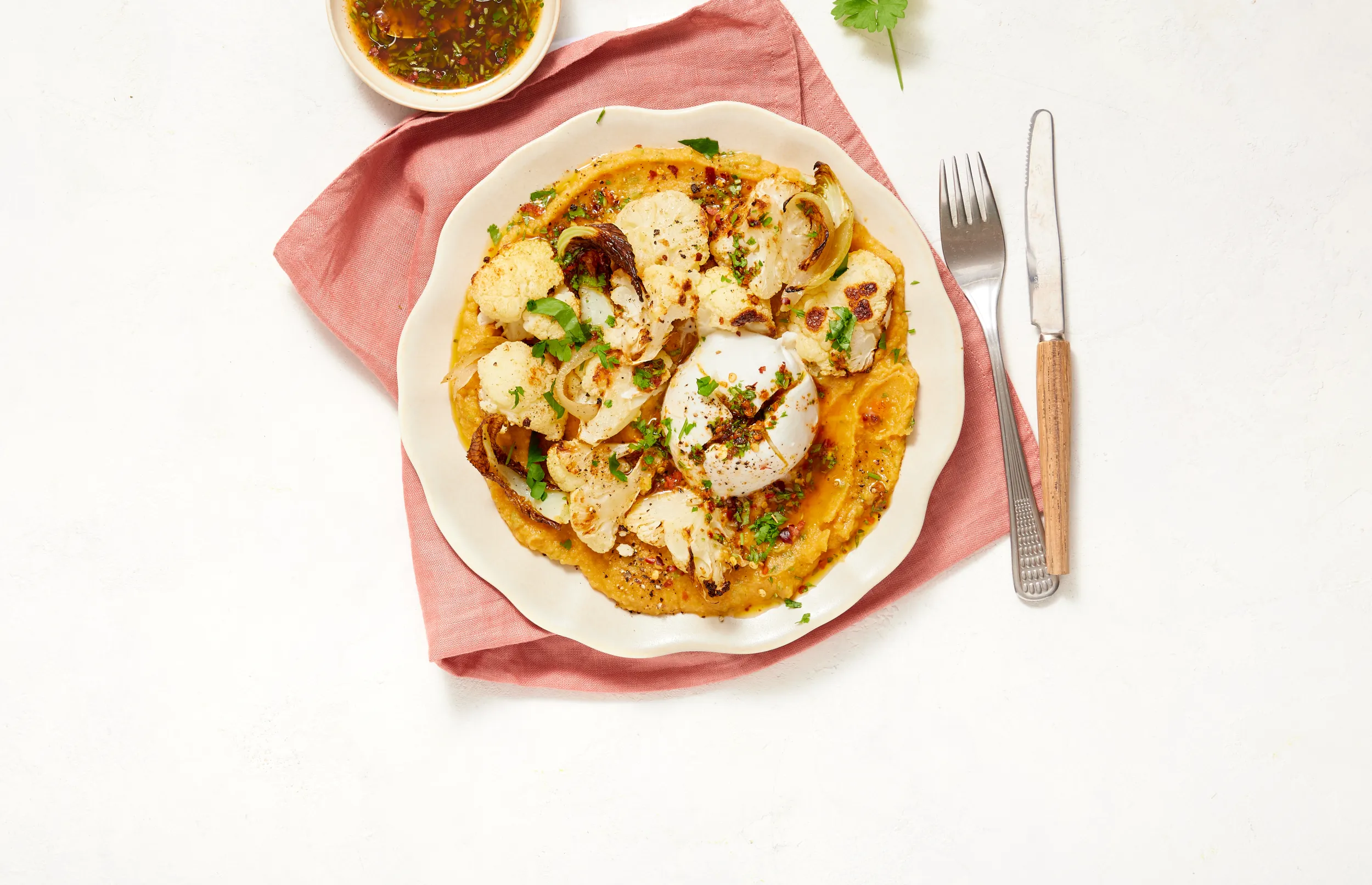 Linzenpuree met geroosterde bloemkool, buffelmozzarella en harissadressing