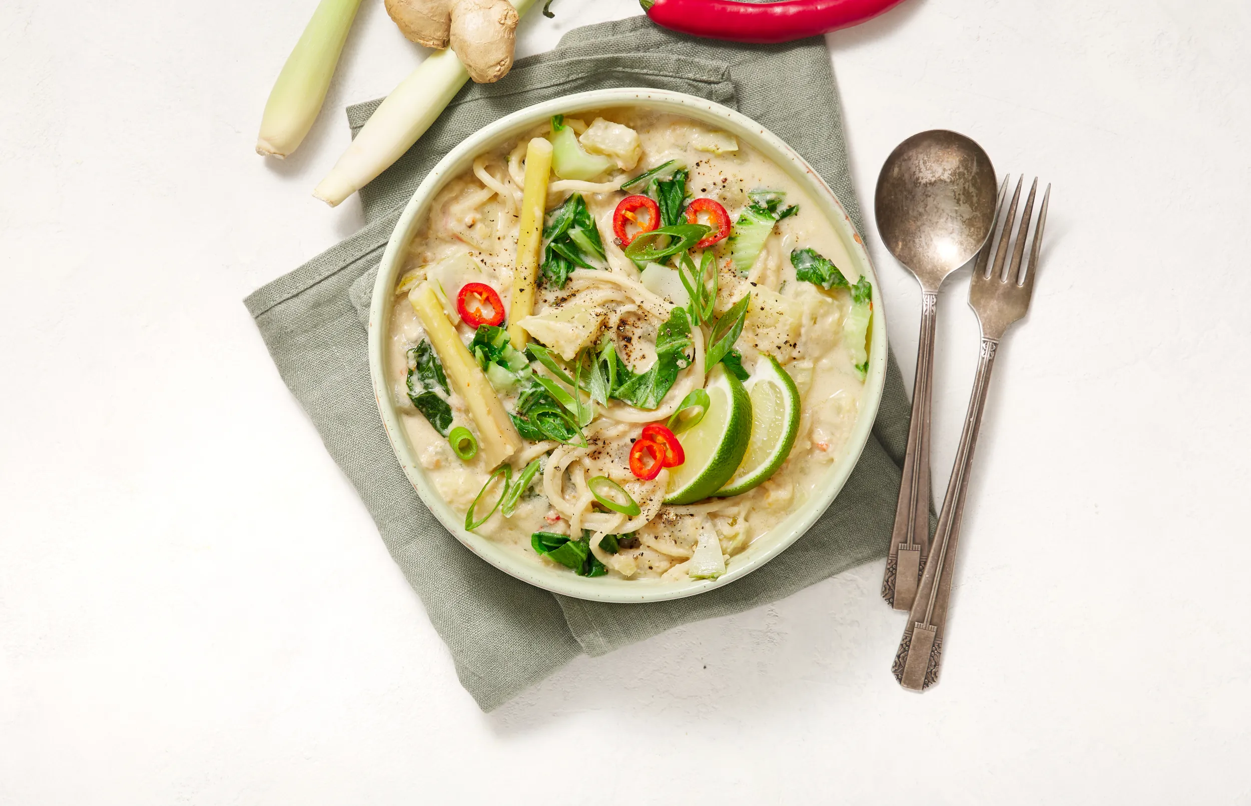 Verwarm olie op middelhoog vuur in een soeppan en voeg de gember, knoflook, lente-ui en citroengrasstengel toe. Bak kort aan, let op dat de knoflook niet verbrandt, dat geeft een bittere smaak. Voeg ½ tl sambal toe en bak een minuutje mee tot de aroma’s vrijkomen.