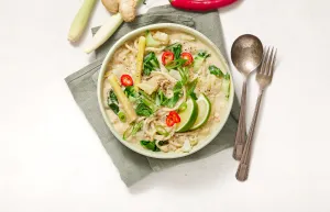 Verwijder de schil van 1 stuk gember en 1 teentje knoflook en hak fijn. Snij het witte en het lichtgroene deel van 1 stengel lente-uien in grove ringen. Snij het donkergroene deel in dunnere ringetjes en bewaar in een schaaltje voor garnering. Kneus 1 stengel citroengras met de achterkant van een mes en snij in 3 of 4 stukken.