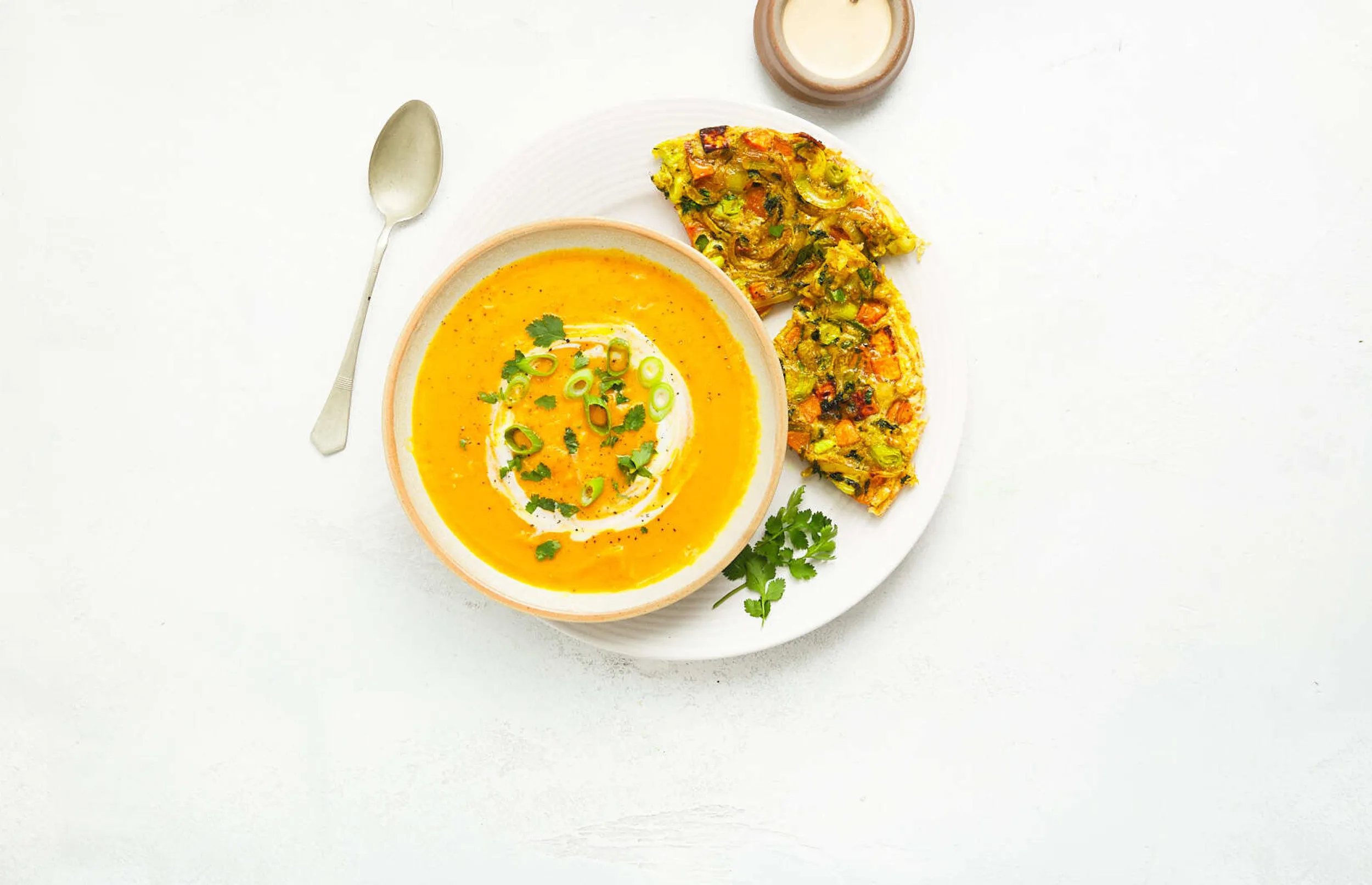 Serveer de frittata samen met het mayo-sojasausje en de soep met eventueel nog een schepje yoghurt naar smaak. Garneer met de overige lente-ui en serveer het brood erbij.