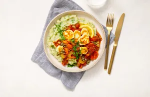 Serveer de tomatensaus met de peterseliepuree, gesmoorde prei en grill kaas.