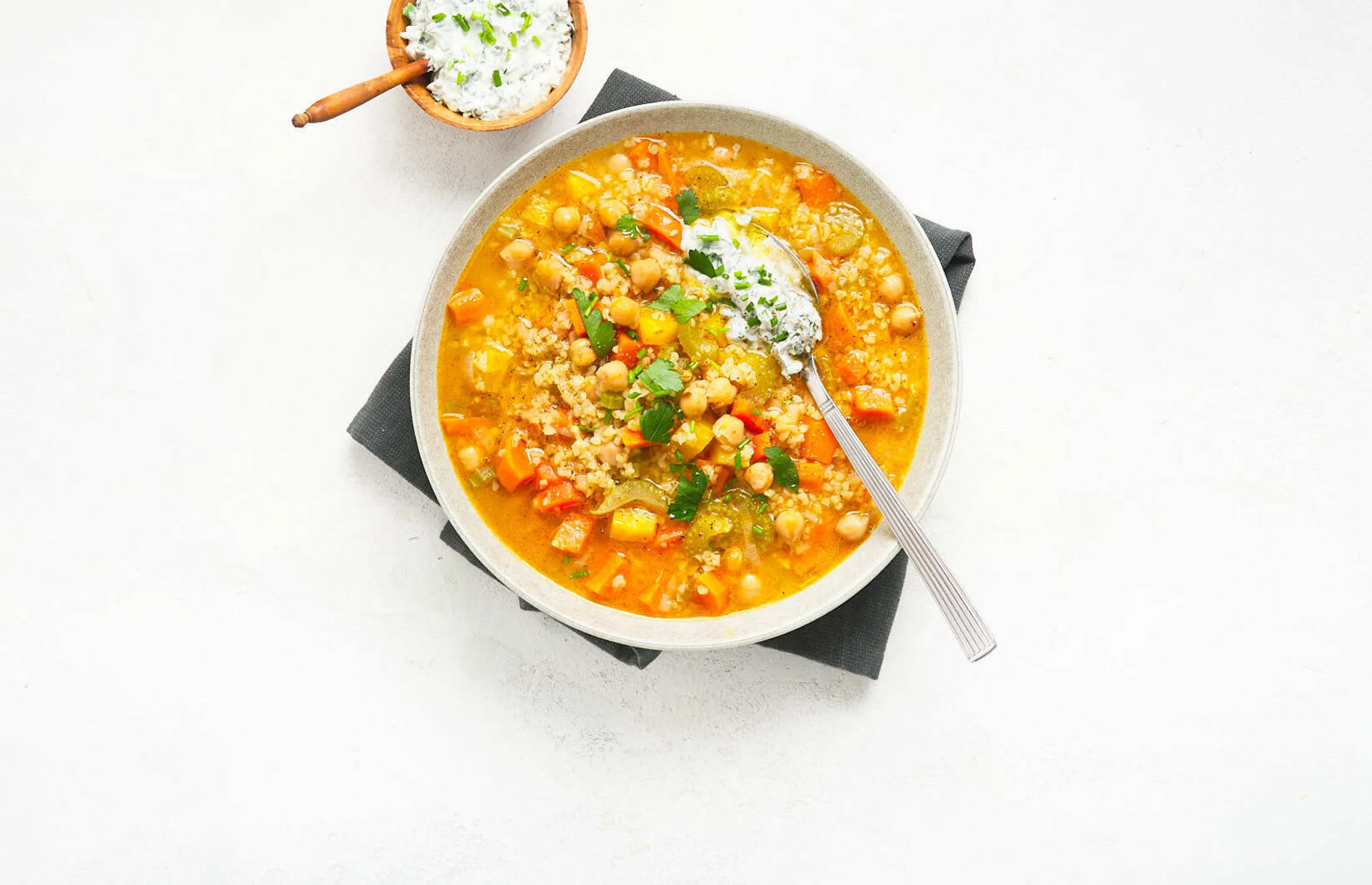 Voeg 1 bakje soepspecerijen bij de groenten en bak zachtjes tot de geuren vrijkomen. Voeg de voorgekookte bulgur (incl. bouillon) en 1 pakje kikkererwten (inclusief vocht voor extra eiwit!) toe. Kook het geheel zachtjes nog ca. 5 minuten.