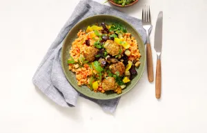 Serveer de pilav met de gehaktballetjes, aubergine en paprika. Garneer met de peterselie. Eet de rucola er als frispittige noot bij of schep een deel door de pilav.